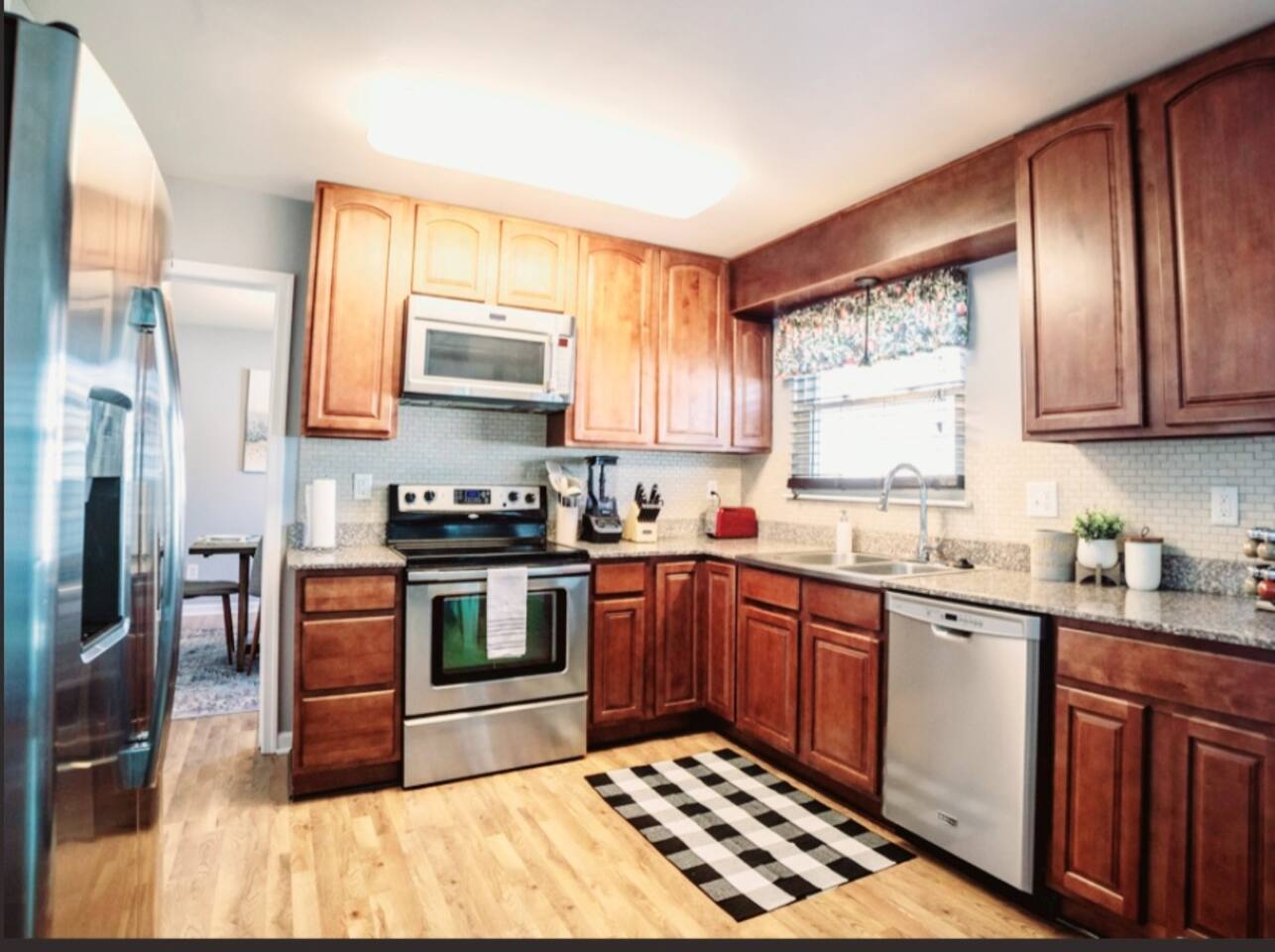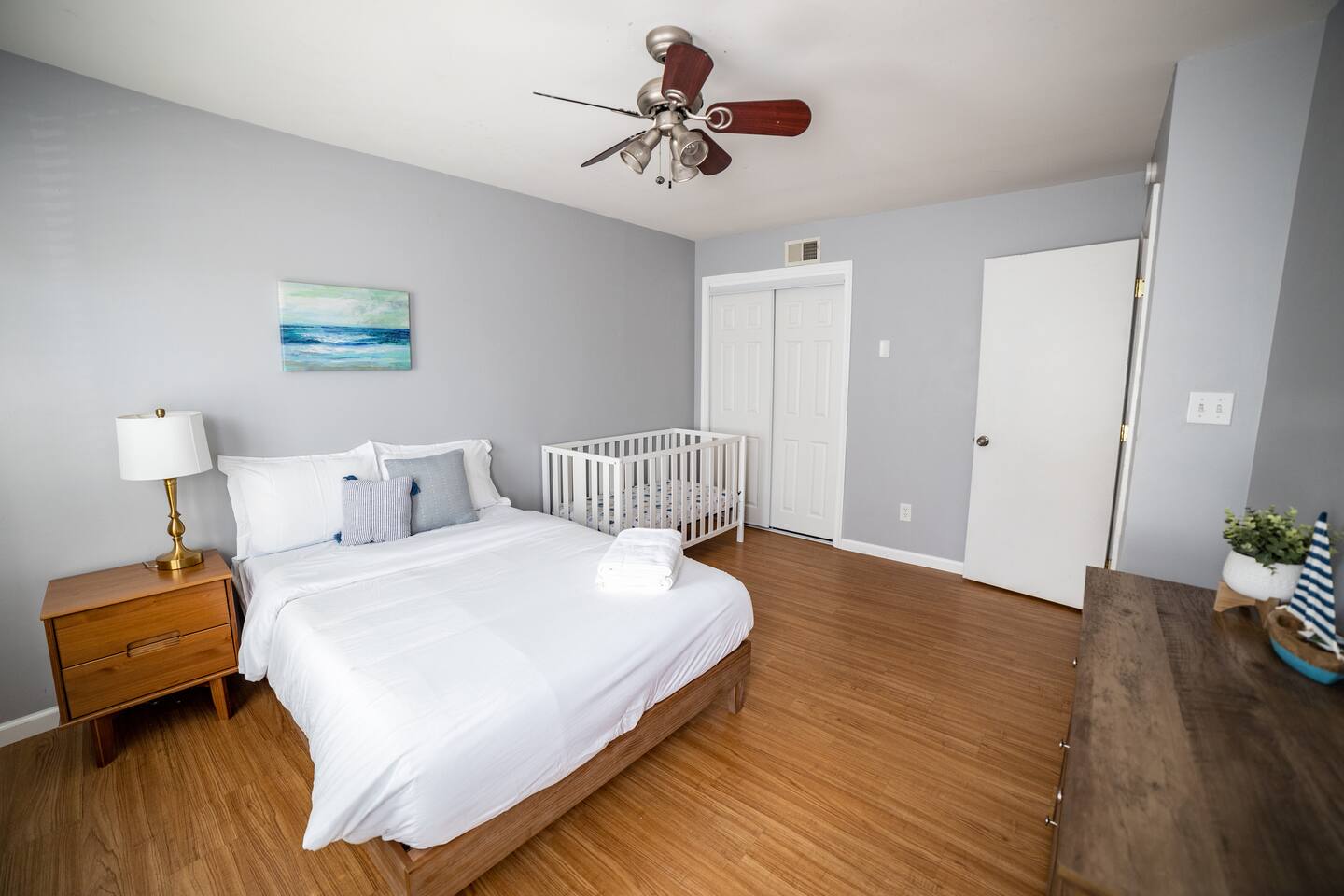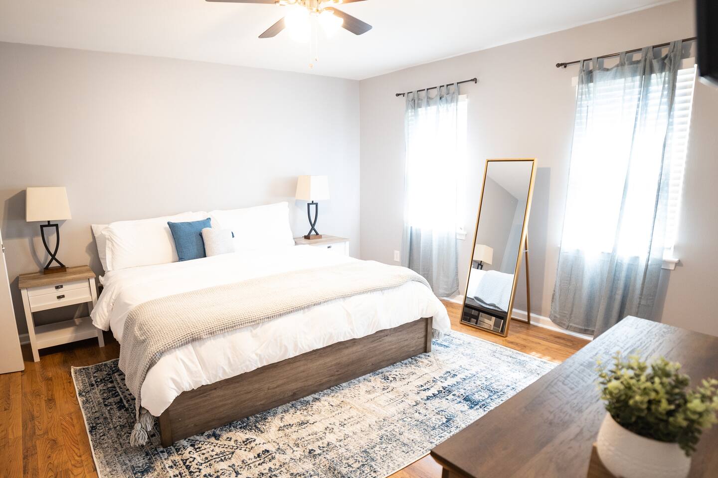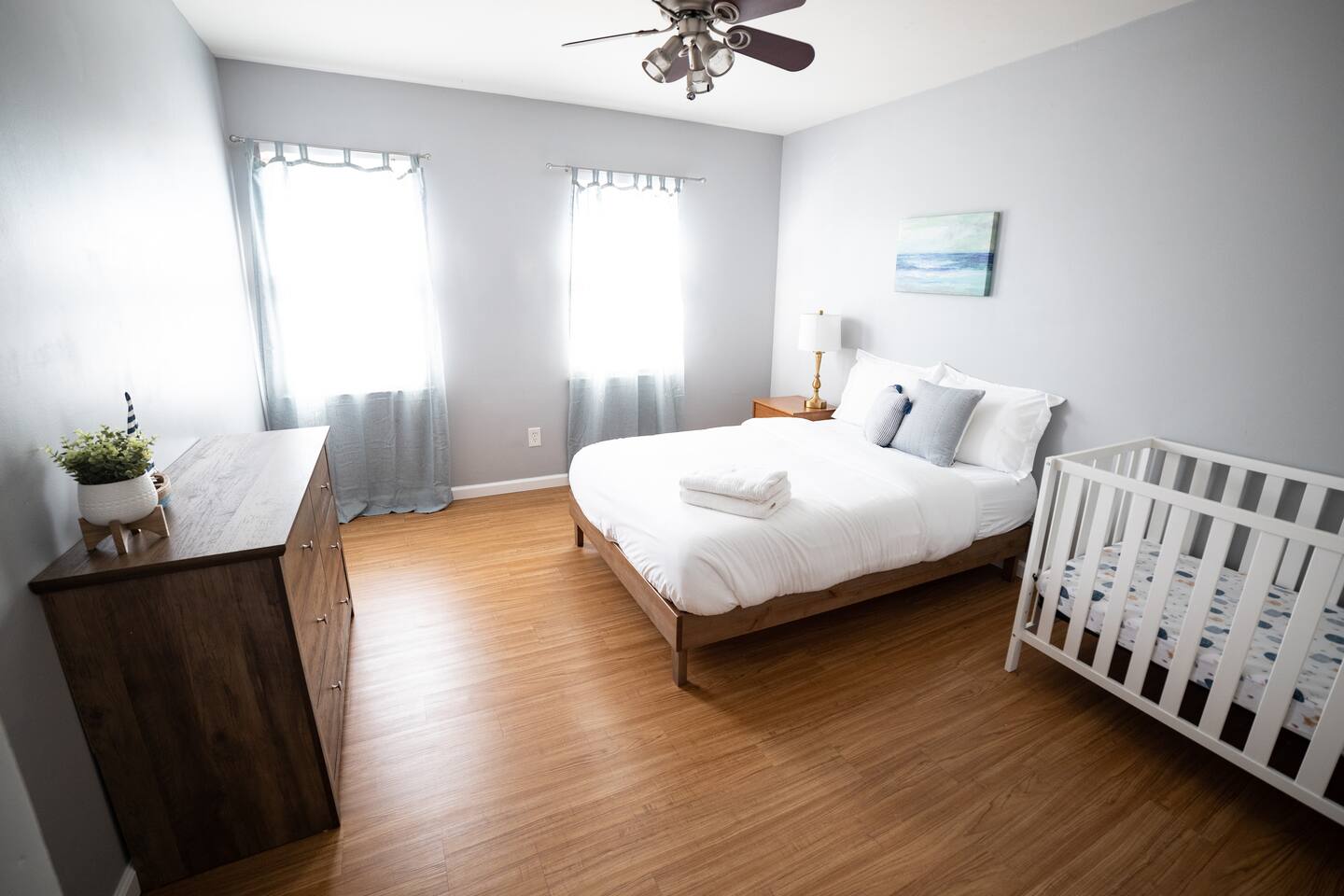 🛋️ THE SPACE This thoughtfully designed home offers the ideal blend of comfort, function, and convenience. Whether you're traveling with family, friends, or colleagues, you'll feel right at home in this cozy yet spacious retreat for 8 guests! 🍳 KITCHEN The kitchen is fully equipped with everything you need, whether you’re brewing your morning coffee or preparing a full meal. Complete with a drip coffee maker, cookware, utensils, and pantry basics, this space is ready to support your stay. 🛏️ BEDROOMS Bedroom 1 (upstairs): Double bed with crib Bedroom 2 (upstairs): King bed with ensuite full bathroom Bedroom 3 (upstairs): 2 single beds Bedroom 4 (upstairs): Queen bed 🚿 BATHROOMS •Bathroom 1 (upstairs): Full bathroom w/ enclosed shower area, located between bedroom 3 and 4 •Bathroom 2 (upstairs): Full bathroom w/ shower, bathroom ensuite to King bedroom suite •Bathroom 3 (downstairs): Half bathroom All includes starter toiletries: shampoo, conditioner, body towels and body wash. 🌟 KEY AMENITIES • Keyless & contactless self-check-in • Outdoor security cameras for added safety • Baby crib and high chair available • Smart TVs (log into your own Netflix, Hulu, Disney+, etc.) • Propane grill • Complimentary washer/dryer with detergent provided • Dedicated workspace for remote work • Fast, free Wi-Fi • Quiet neighborhood across from park w/ children’s playground • Dedicated street parking in front of the house 🧼 CLEANING & SAFETY We follow strict cleaning protocols before each stay, with added disinfection of all high-touch surfaces including light switches, remote controls, doorknobs, and keypads. 🏡 LONG-TERM OPTIONS? Monthly rentals available! Please submit inquiry for our special monthly pricing.